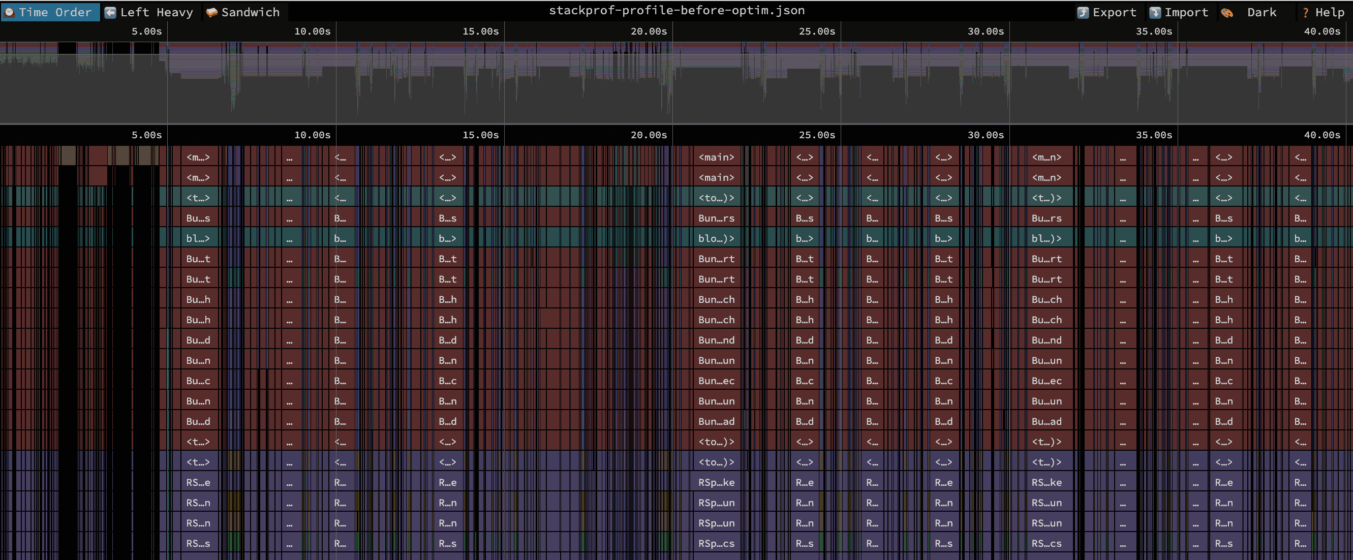 stackprof tmp/stackprof-profile.dump --json > tmp/stackprof-profile.jsonAfter loading up a JSON file into Speedscope, you should be greeted by a flamegraph. By default, they look something like this: