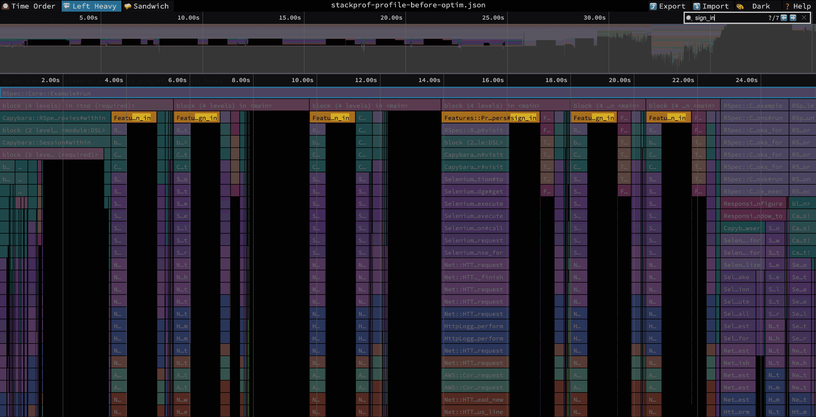 This pattern is usually pretty easy to spot when looking at a flamegraph that contains multiple test executions because there will be noticeable repetition across specs: