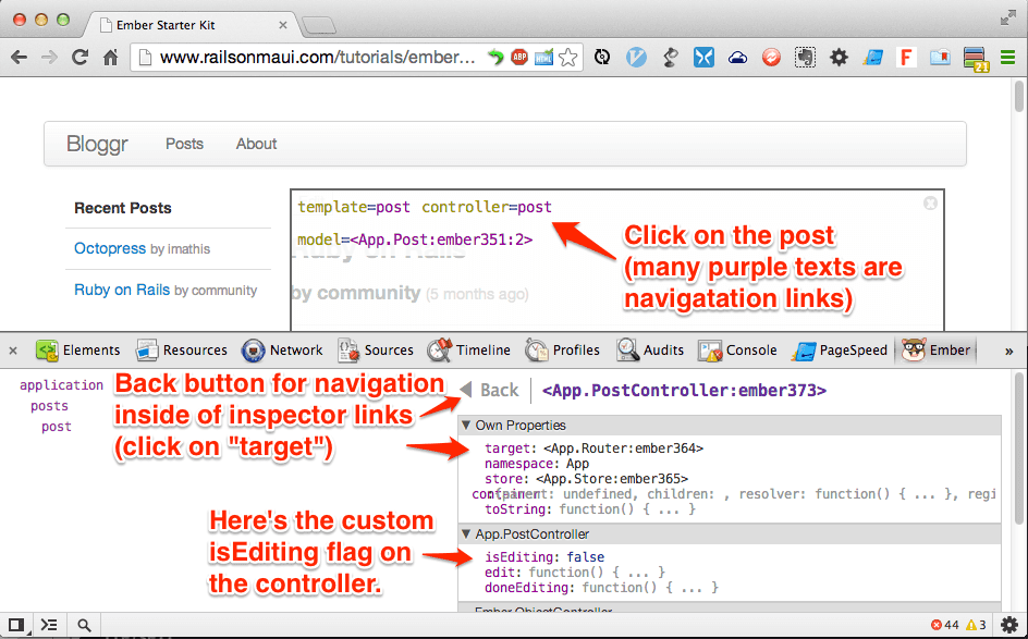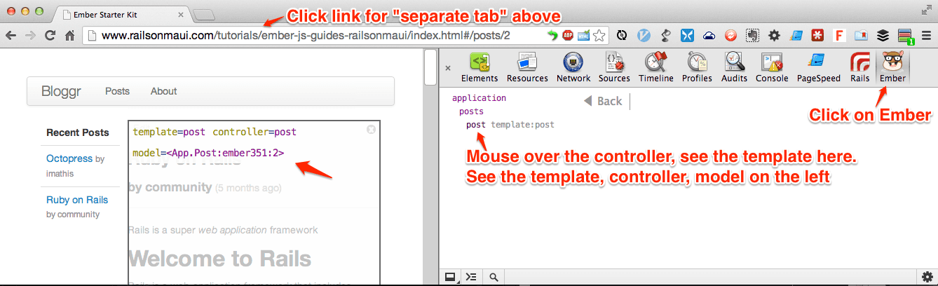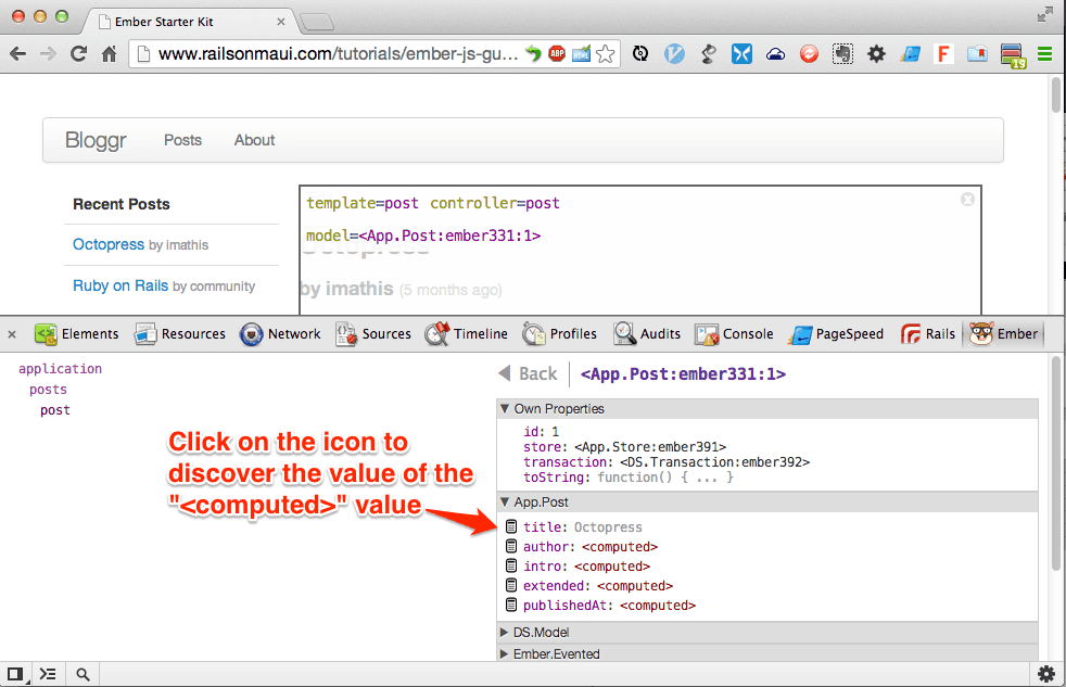 Then try out the "Ember Inspector for Chrome". Yehuda does a nice demo of it on youtube (more here). You can follow the installation instructions from Kasper Tidemann. Basically you want to install the chrome extension files from github.com/tildeio/ember-extension.