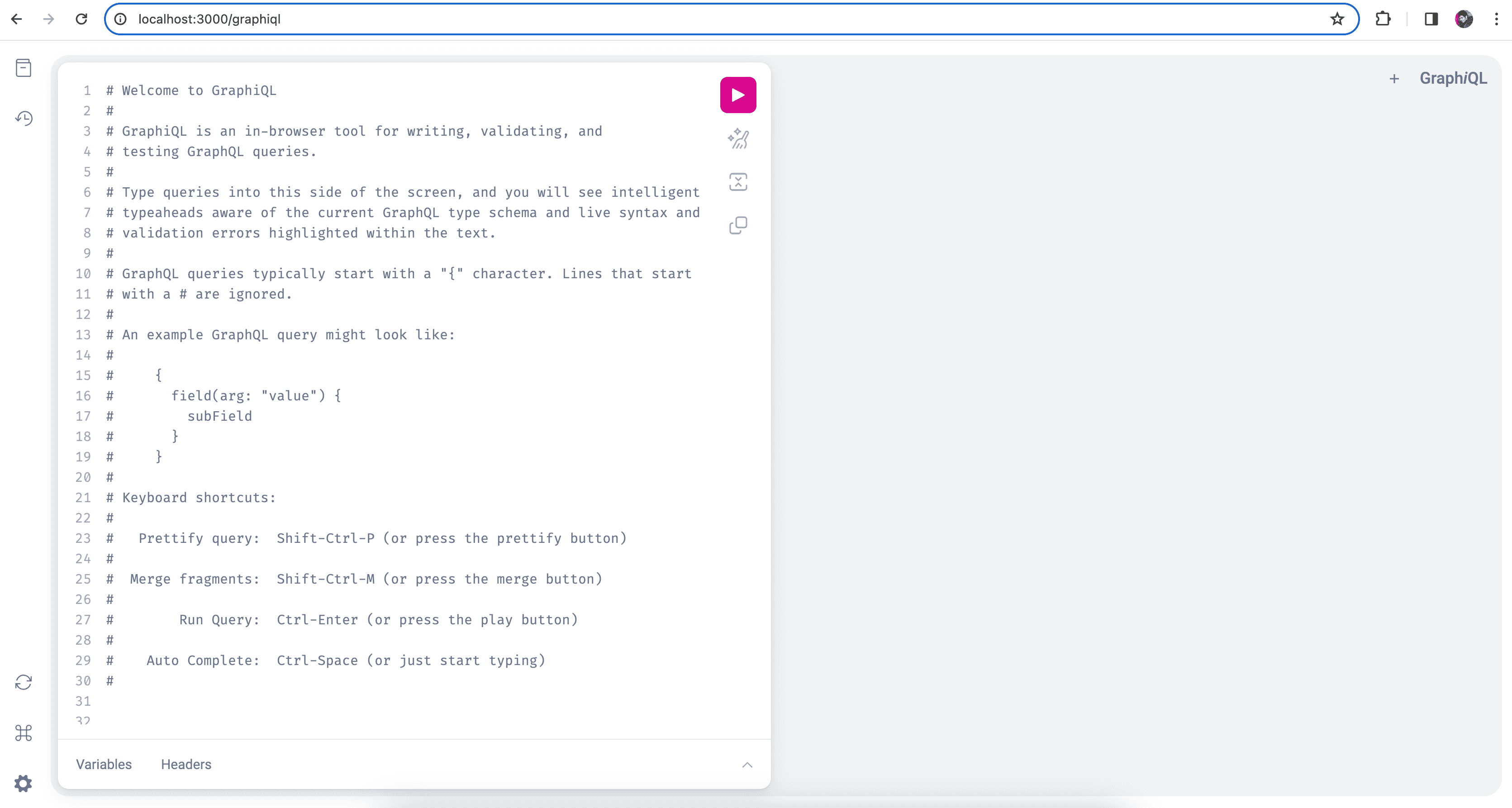 To test post creation, navigate to localhost:3000/graphiql in your browser. In the left side of the editor, type in the following query: