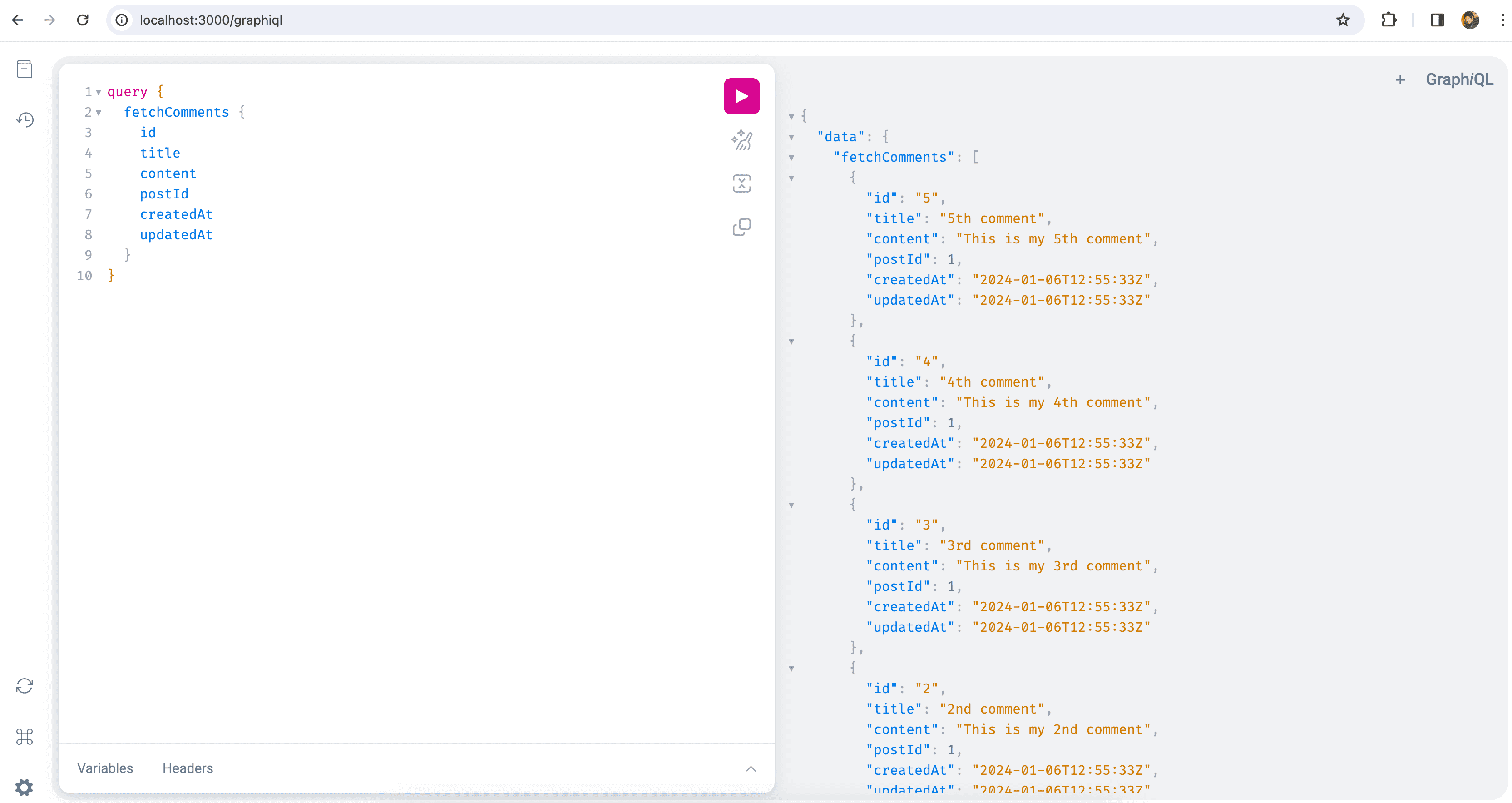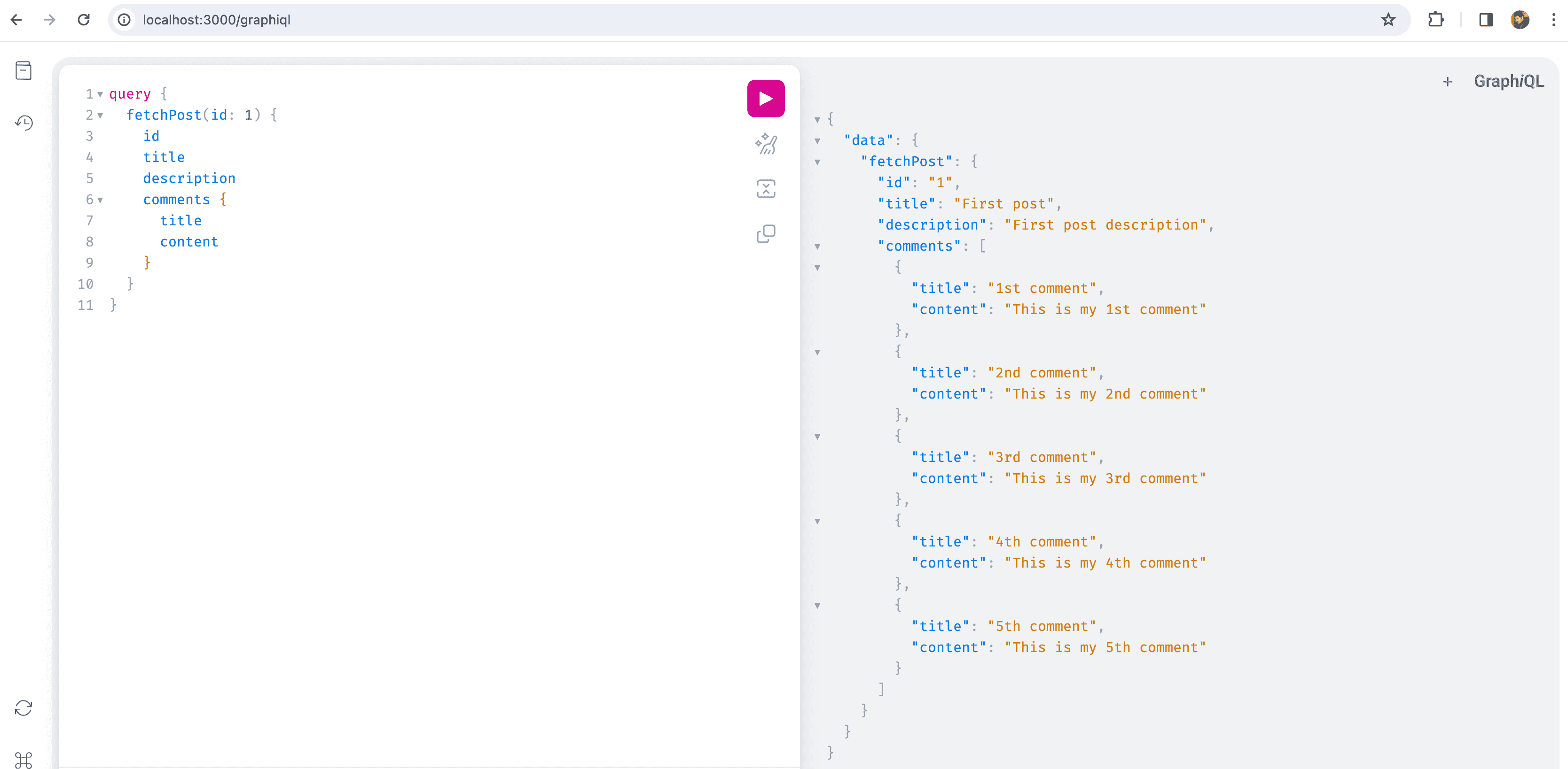 Your application is now ready to fetch the posts and comments. Navigate to your browser and hit the localhost:3000/graphiql endpoint. On the left side, add the query below.
