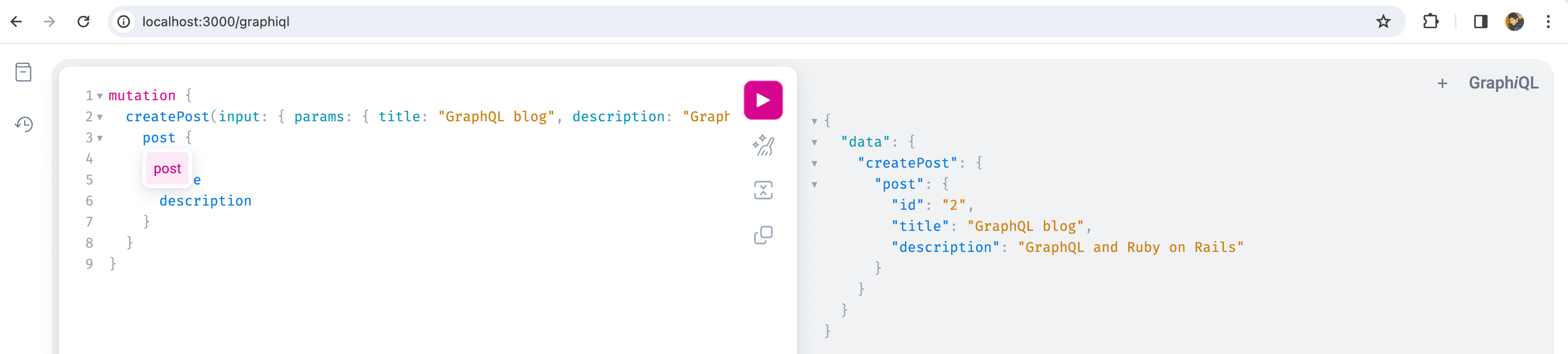 createPost(input: { params: { title: "GraphQL blog", description: "GraphQL and Ruby on Rails"  }}) {