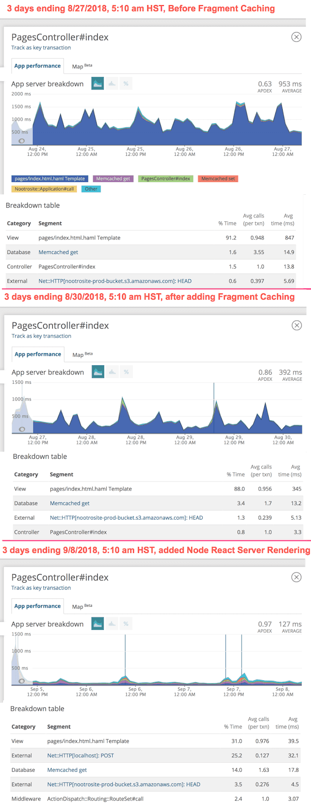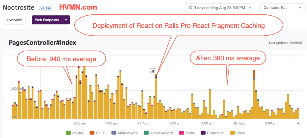 Fragment Caching made the biggest difference in overall response times. Measuring the 3 days before and after fragment caching was added, Scout reported a 59% improvement in the median response time for the site’s main controller action (PagesController#index), from 943ms to 382ms. Similarly, New Relic reported the average execution time going from 953ms to 392ms, a 59% improvement.
