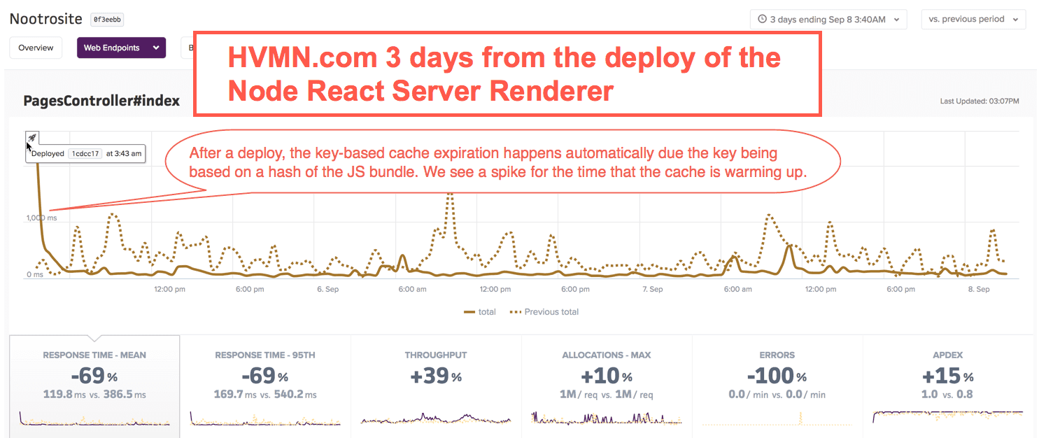 React on Rails Pro Node React Server Rendering provided a healthy boost in performance. Measuring the 3 days before and after the rendering engine change, Scout reported a 69% drop in the median response time, going from 387ms to 120ms. New Relic reported a similar gain of 68% drop in the average response time.