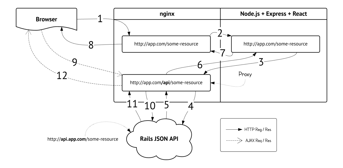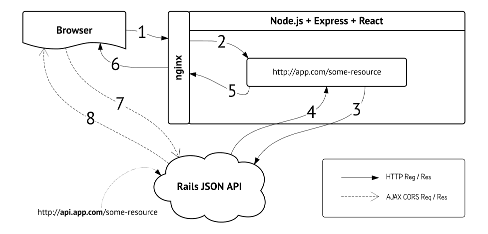 Let’s go deeper. When user hits http://my-app.com, request goes to the Node.js server with Express on top. We need the data to render initial html and send the response. So we fetch it from Rails API via http-request. When the data is arrived, React renders the view and Express sends html to the user with client JS app, which takes control over the flow. When the user hits some link on the site, app makes the ajax call to fetch the new data and updates the views on the client.