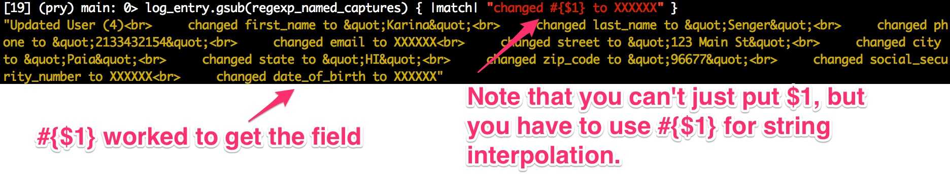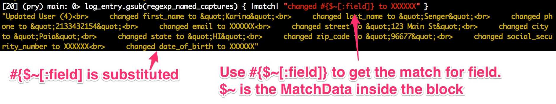 log_entry.gsub(regexp_named_captures) { |match| "changed #{$~[:field]} to XXXXXX" }Nice! That works!