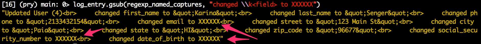 log_entry.gsub(regexp_named_captures, "changed \\k<field> to XXXXXX")And that results in mission accomplished!