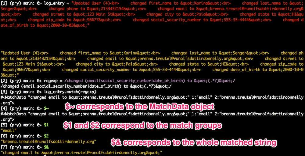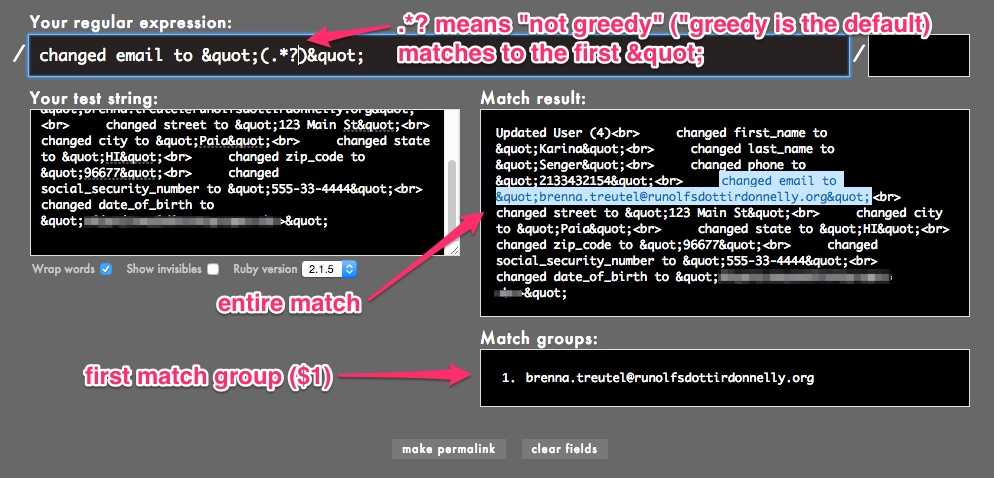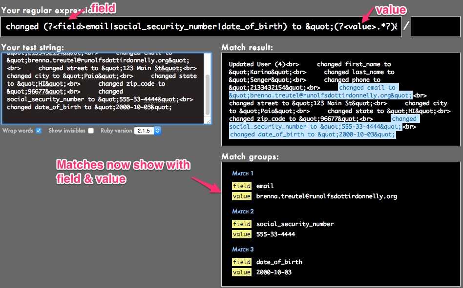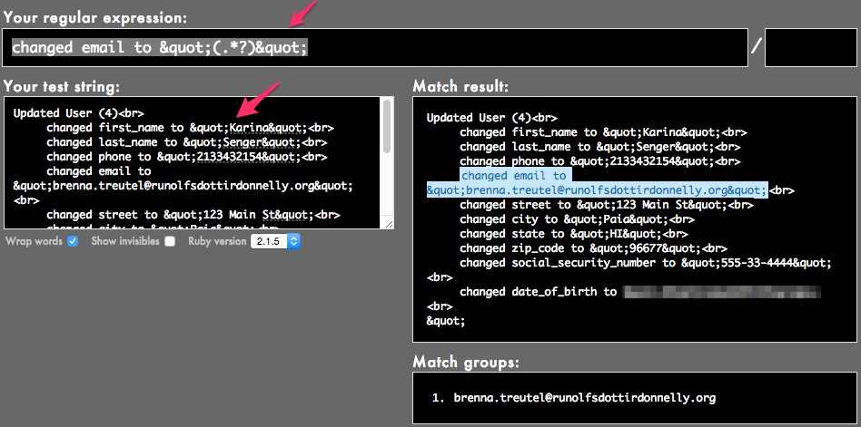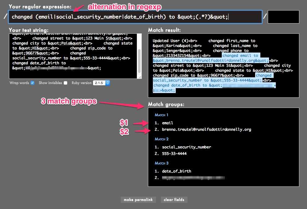 regexp = /changed (email|social_security_number|date_of_birth) to "(.*?)"/Then enter the following. Feel free to experiment!
