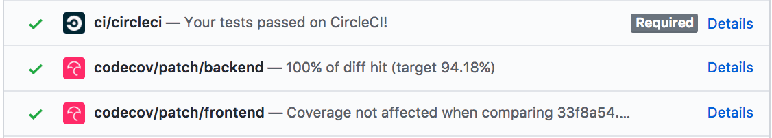 Here’s how we set CodeCov to give us separate frontend and backend coverage status (I prefer to only see the patch status so I turned project off). Note that the partial line coverage feature seems to cause “file not found in report” errors in CodeCov when trying to view your files, so I don’t enable it here.