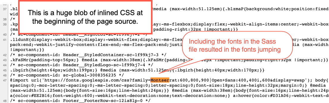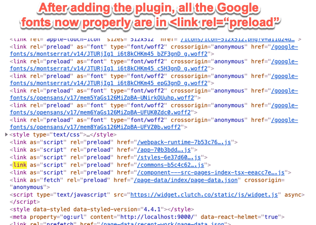 Aha! There had to be a problem with the HTML generated for the ShakaCode home page. I bet it doesn't preload! Sure enough, it wasn't! I verified that by searching the page source for the font "Montserrat," which was buried inside a mass of inlined CSS. Yep, no preload!