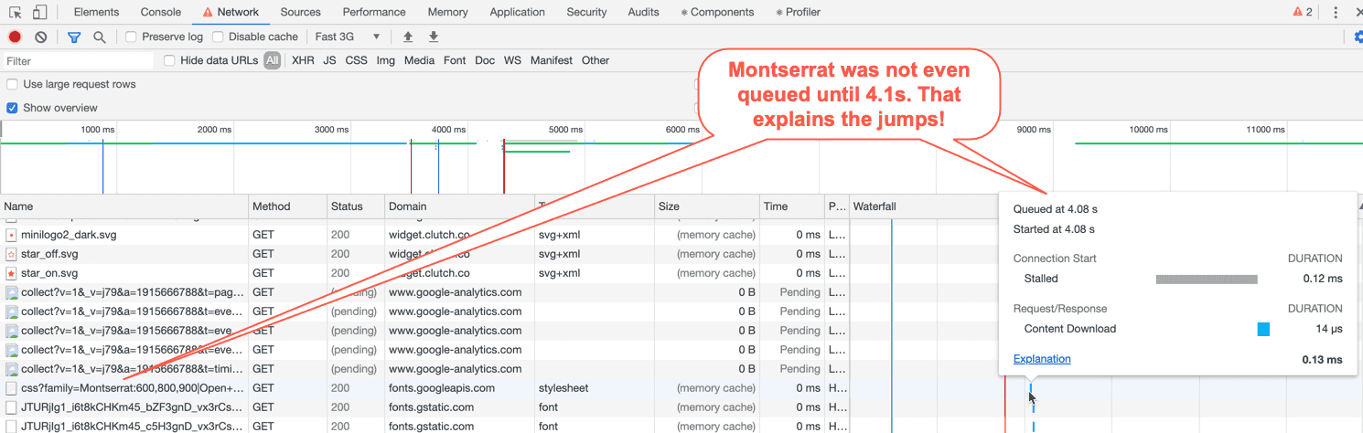 OMG! Of course, the page jumps! The Montserrat font was not even queued until 4.1s!