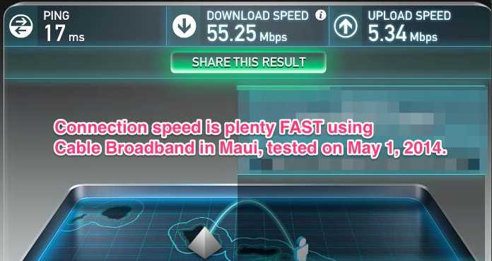 I use a combination of the fastest cable and the fastest DSL I can buy in Maui, served on a load-balancing ZyXEL ZyWall USG 50 Router. DSL is far slower than the cable service, but I still keep it for the one day that cable is not working right. As an additional backup, I have a Verizon LTE tethering plan for my iPhone 5, so the chances that I'm totally out of Internet are low. Here's a screenshot from http://www.speedtest.net