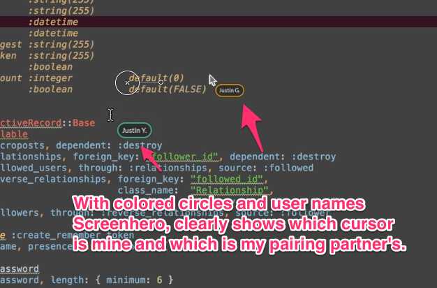 We both used Screenhero on Macs. I've done plenty of remote pair programming using Google Hangouts, but typically only one person sharing the screen drives the code. Screenhero allows true screen sharing such that both programmers can do the typing and mousing. With the shared screen being a 27" Cinema display, I set my Screenhero window to full screen and the resolution was nearly perfect. Yes, when scrolling and switching apps, there is a slight delay, but it was extremely manageable to the point that I almost would forget that I'm working on a computer 3000 miles away. Although there's a slight slowness in seeing keys that you type, it's minor enough that it's not a nuisance. The dual cursor support works great. Here's a video demo of the dual cursor support.
