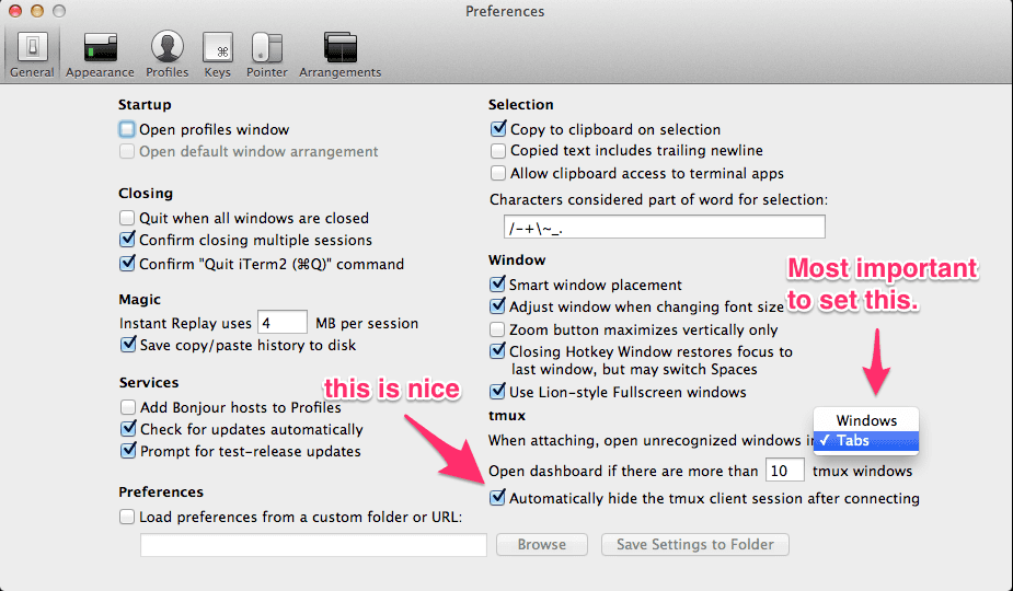 2. Configure your Tmux to open tabs rather than windows. This is key to getting the iTerm2 version to look like your original tmux session.