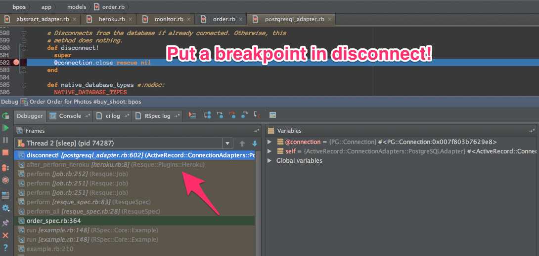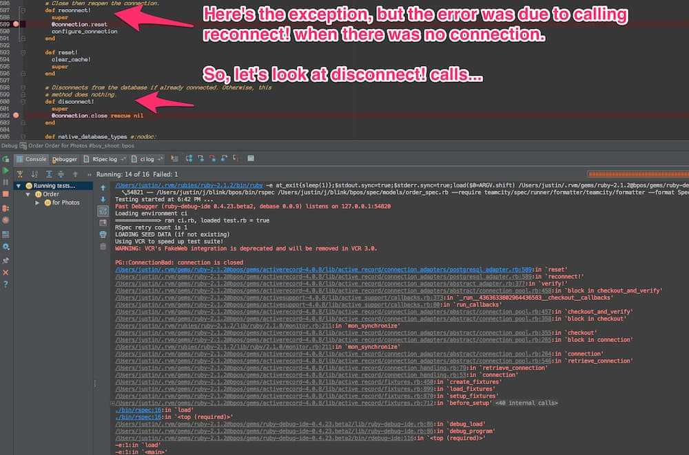 In the really troubling issue I saw below, I put in breakpoints in the connection adapter gem. I correctly guessed the cause of the error was disconnect! rather than the reconnect!