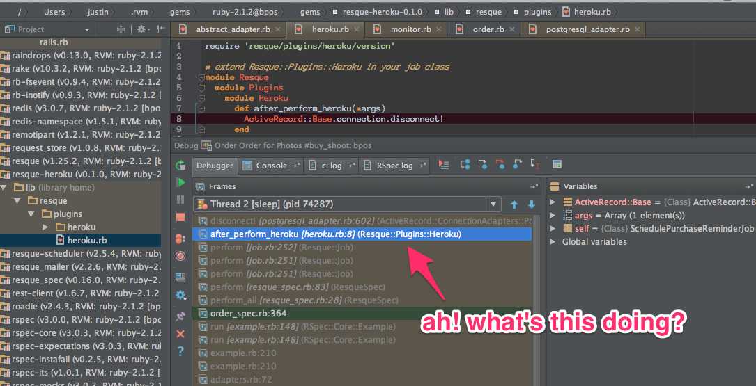 Note, an alternative to using breakpoints in RubyMine would have been to put in a puts caller in the suspect methods of the libraries. However, one would have to remember to remove that later! I think the debugger was a good pick for this issue. If you don't use RubyMine, you might try the ruby debugger or the pry gem.
