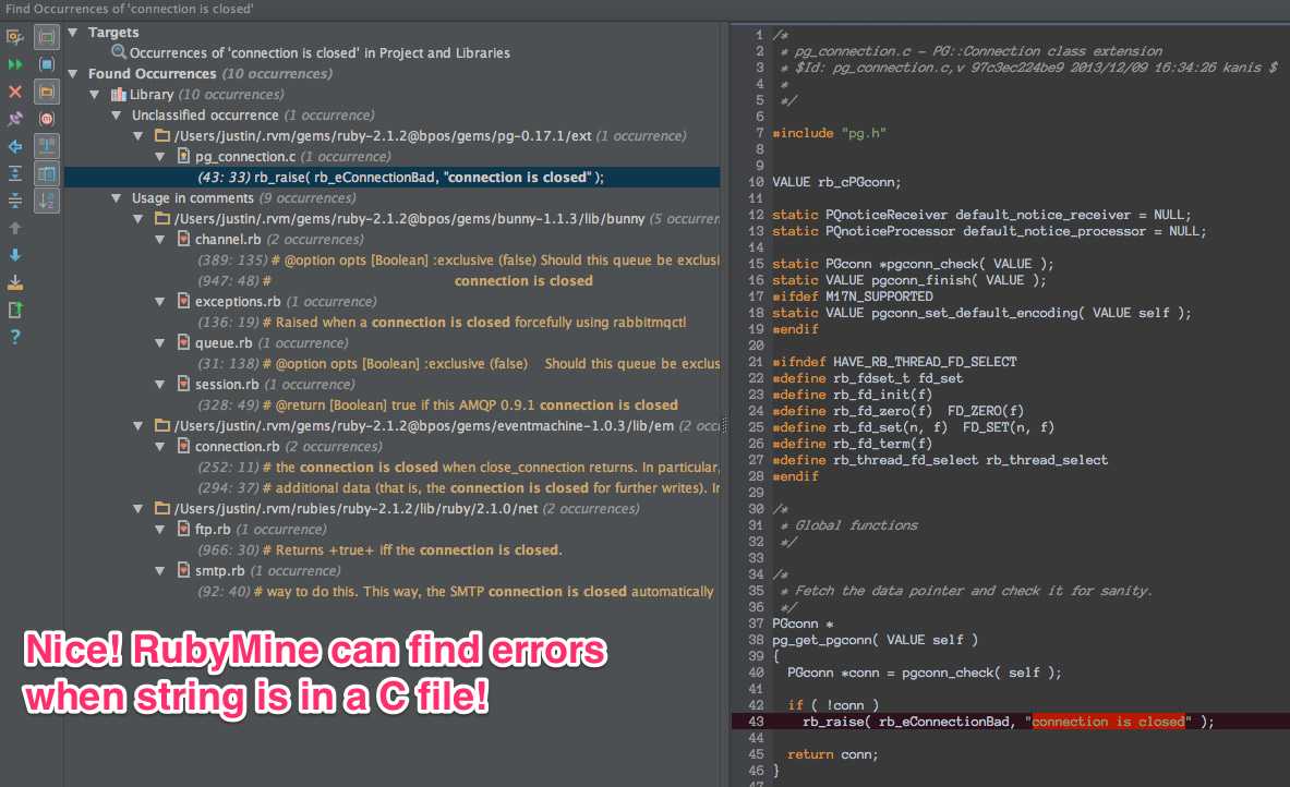 RubyMine's Find in Path, searching Project and Libraries, is extremely useful to getting more context around an error message. In this case, RubyMine found the error message in a C file.